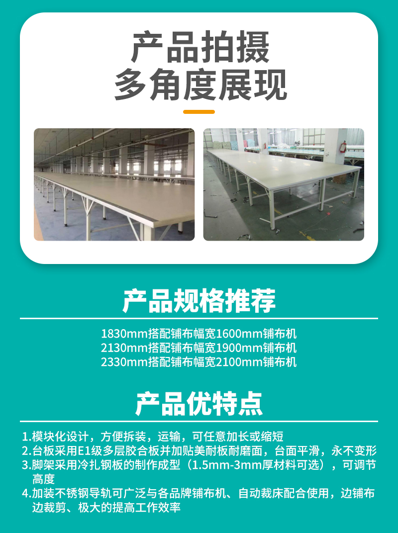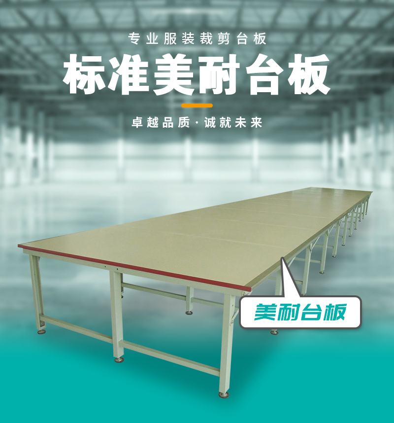 模塊化設計,方便拆裝,運輸,可任意加長或縮短;臺板采用E1級多層膠合板并加貼美耐板耐磨面,臺面平滑,永不變形;腳架采用冷扎鋼板的制作成型 (1.5mm-3mm厚材料可選) ,可調節高度;加裝不銹鋼導軌可廣泛與各品牌鋪布機、自動裁床配合使用,邊鋪布邊裁剪、極大的提高工作效率。