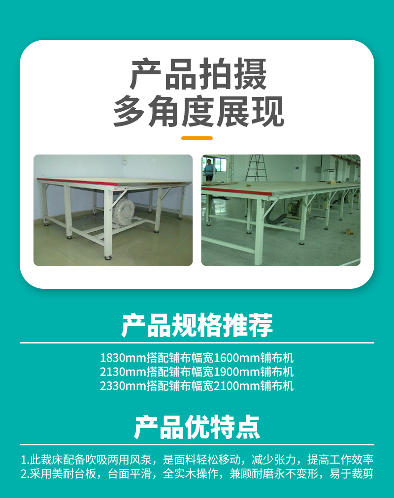此裁床配備吹吸兩用風泵,是面料輕松移動,減少張力,提高工作效率;采用美耐臺板,臺面平滑,全實木操作,兼顧耐磨永不變形,易于裁剪。
